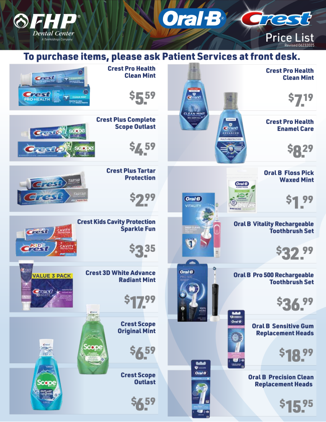 Get the most out of your daily oral care routine! Crest and Oral B products now available at FHP Dental Center. Oral-B electric toothbrushes, the first to be accepted by the American Dental Association (ADA). Convenient to purchase! Competitive pricing! Click to see price.