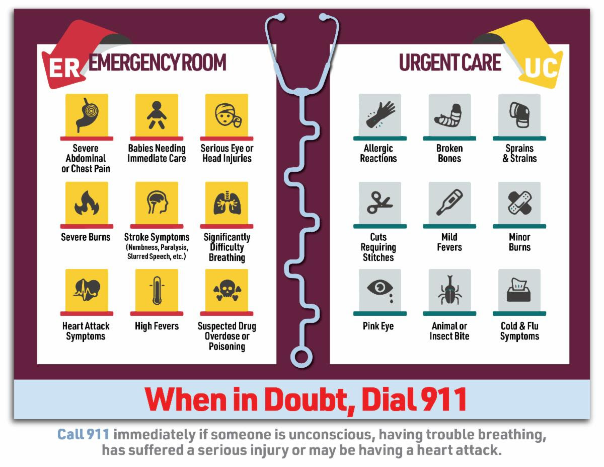 Of course, some situations require the Emergency Room — specifically, severe chest or abdominal pain, stroke symptoms, significant difficulty breathing, heart attack symptoms, serious head or eye injuries, severe burns, high fevers, or suspected poisoning. In these cases, call 911 immediately.